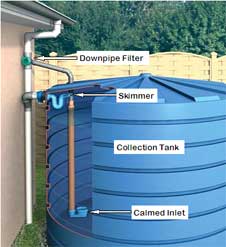 The first and most important consideration in designing any Rainwater Harvesting Scheme is the rainwater collection tank. This should be as large as possible to overcome any drought conditions especially if garden watering is one item you expect to carryout in times of a "hosepipe ban".